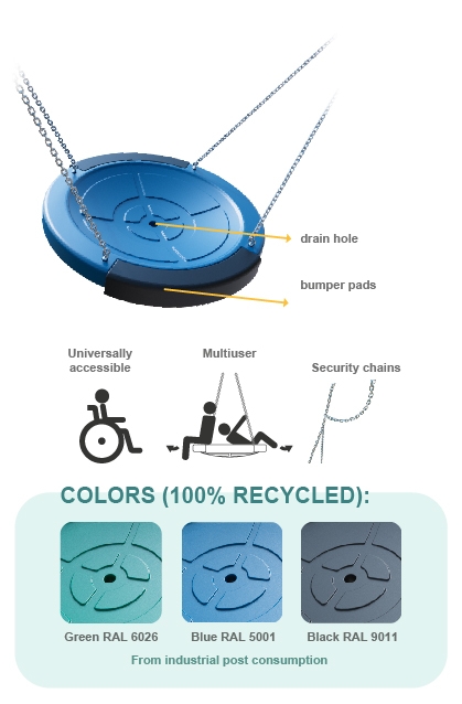 Birds nest swing seat designed and certified under the EN 1176-1:2017 standard and suitable for accessible parks according to spanish order TMA/851/2021.