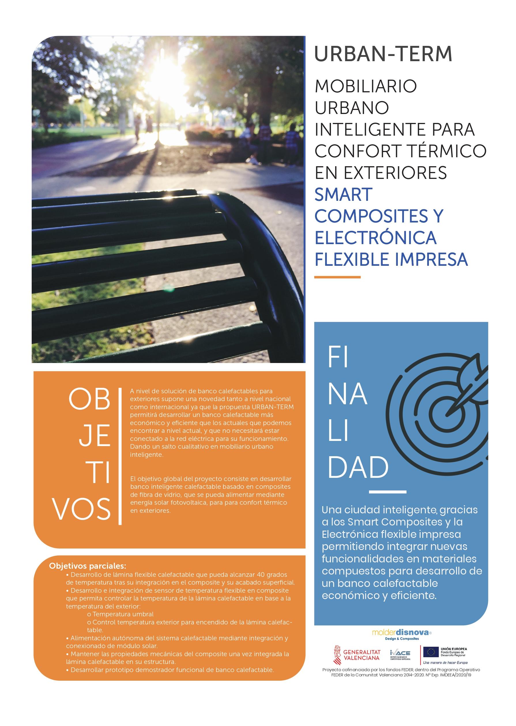 El proyecto innovador URBAN - TERM, que ha sido desarrollado por la empresa MOLDER-DISNOVA, S.L y que cuenta con la financiación del IVACE (Institut Valencià de Competitivitat Empresarial), tiene como objetivo, el desarrollo de un banco inteligente calefactable basado en composites de fibra de vidrio, además de contar con la capacidad de alimentarse mediante energía solar fotovoltaica.